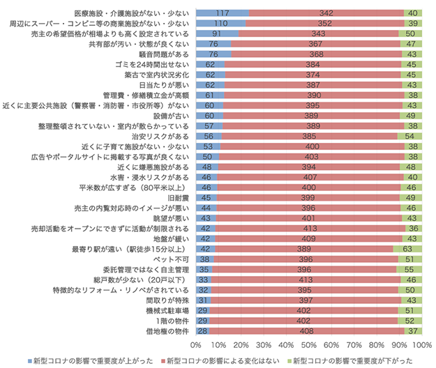 売れない・売れづらい不動産の理由のうち、『新型コロナウイルスの影響で重要度が増した』と思うものを聞いたところ、上位2つは「周辺に医療施設・介護施設がない・少ない」と「周辺にスーパー・コンビニなどの商業施設がない・少ない」となり、新型コロナの影響で周辺の利便性が求められるようになっていることが伺える結果となった。
