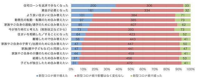 『売り主からの不動産売却に関する相談内容のうち、新型コロナの影響で増加したもの』としては、「住宅ローンを返済できなくなった」、「資金が必要となった」の2つが特に多く、「より良い住まいに住み替えたい」、「転勤・転職のために住み替えたい」と続いた。