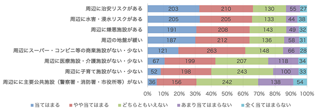 『周辺環境』に限定した理由としては、「周辺に治安リスクがある」、「周辺に水害・浸水リスクがある」、「周辺に嫌悪施設がある」、「周辺の地盤が緩い」などを挙げた人が多かった。スーパーやコンビニ、公共施設、子育て施設といった施設環境の有無よりも、水害・浸水リスクや治安リスクといったリスクの方が売買には影響を与えやすいと考えられていることがわかった。
