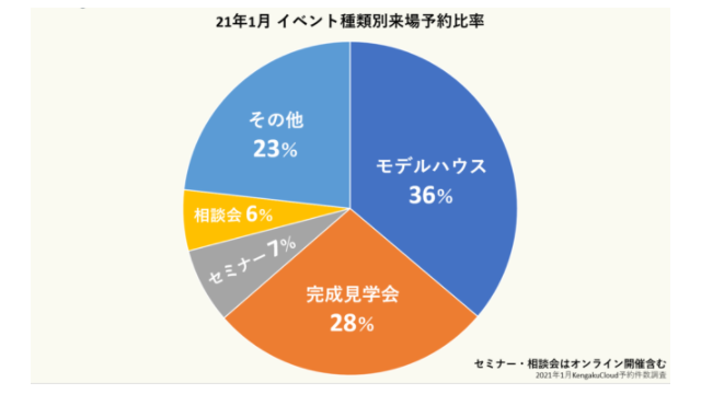 1月1日~25日のカテゴリ別来場予約比率としては、「モデルハウス」が36%と最も多く、次いで「完成見学会」28%となった。それ以外は「セミナー」7%(うち4割がオンライン開催)、「相談会」6%(うち3割がオンライン開催)、「その他(ワークショップ、構造見学会、OB邸見学会など)」23%となった。モデルハウスはこれまで予約なしでの来場が主だったが、3密回避のため1時間1組限定などの対応を行う住宅事業者が増えたことで、コロナ禍以降オンライン予約比率が上がっているという。完成見学会については、完全予約制での開催が一般的となり、エンドユーザーのニーズと合致したことで堅調な推移を見せているという。