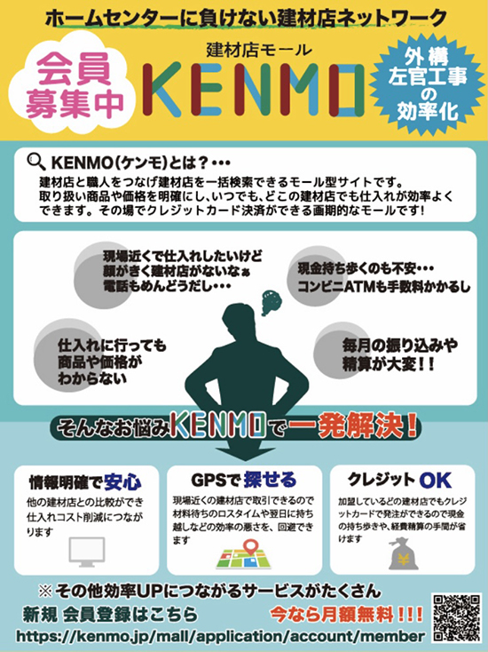 ナカエクステリア(名古屋市)はこのほど、建材店と職人をつなぎ、建材店を一括検索できるモール型サイト「建材店モール KENMO(ケンモ)」の運用を開始した。