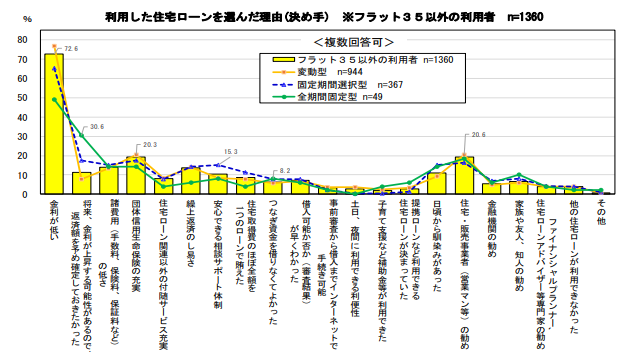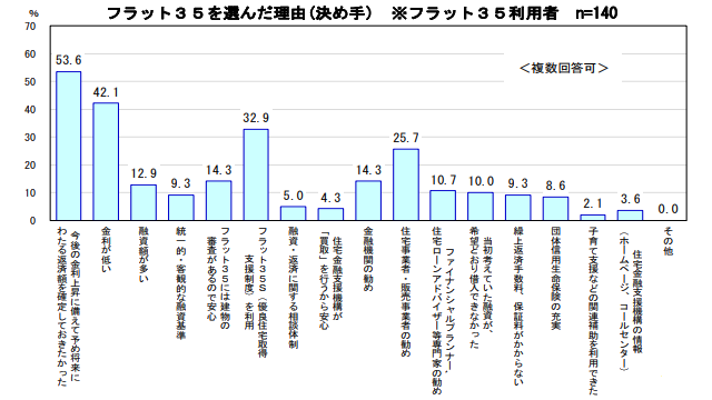 フラット35利用者では「返済額を確定しておきたかった」が53.6%で最も多く、次いで「金利が低い」(42.1%)、「フラット35S(有料住宅取得支援制度)を利用」(32.9%)、「住宅事業者・販売事業者の勧め」(25.7%)と続いた。