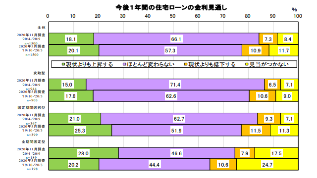 今後1年間の住宅ローン金利見通しについては、「ほとんど変わらない」が66.1%で前回から(57.3%)増加。一方で「現状よりも上昇する」が18.1%(前回=20.1%)、「現状よりも低下する」が7.3%(前回=10.9%)、「見当がつかない」が8.4%(前回=11.7%)とそれぞれ減少した。