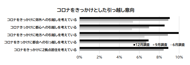 コロナ禍をきっかけとした引っ越し意向としては、「郊外への引っ越しを考えている」が9.1%、「都心へ」が8.5%、「地方へ」10.0%、「都会へ」6.9%となり、いずれも前回の調査より増加した。また、郊外派と都心派の差が縮小した。「コロナをきっかけに2拠点生活を考えている」は8.9%と、9月の8.4%から微増。なお、引っ越し検討について、テレワーク実施者のほうがテレワーク非実施者よりも大幅に高い傾向には変化はなかった。