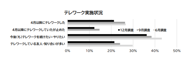 「4月以降のテレワーク実施率」は21.2%と、9月調査(26.3%)、6月調査(26.6%)と比べて減少した。「今後もテレワークを続けたい・やりたい」と回答した人は6月が43.1%だったのに対し、9月が38.4%、12月(今回調査)が36.2%と徐々に低下している。