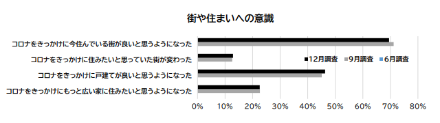 「コロナをきっかけに戸建てが良いと思うようになった」と回答した人は46.3%(9月調査:45.1%)、「コロナをきっかけにもっと広い家に住みたいと思うようになった」は22.6%(同:22.6%)だった。「コロナをきっかけに今住んでいる街が良いと思うようになった」は69.5%(同:71.2%)と依然高く、「コロナをきっかけに住みたいと思っていた街が変わった」は12.9%(同:12.6%)と、低水準のままとなった。