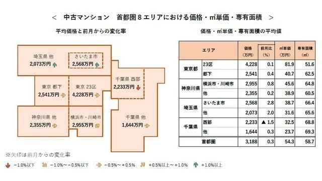 中古マンションの首都圏の1戸あたり平均価格は3188万円で前月比0.3%上昇。エリア別では「東京23区」は3カ月連続、「千葉県他」は2カ月連続で2017年1月以降の最高額を更新。「さいたま市」「埼玉県他」は両エリアとも前月比+2.0%以上と上昇が目立ち、「埼玉県他」は過去最高額を更新した。