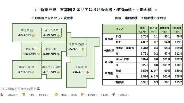 新築戸建ての首都圏の平均価格は3981万円で前月比0.3%上昇。エリア別では「東京23区」が2カ月連続で上昇し、2017年1月以降の最高額を更新。「埼玉県他」は前月比横ばいも、4カ月連続で過去最高額となった。