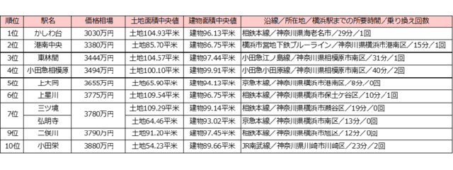『中古一戸建て編』の1位は「かしわ台駅(相鉄本線)」で、価格相場は3030万円、土地面積中央値は104.93m2、建物中央値は96.13m2。2位は「港南中央(横浜市営地下鉄ブルーライン)」(同:3380万円)、3位は「東林間(小田急江ノ島線)」(同:3444万円)、4位は「小田急相模原(小田急小田原線)」(同:3494万円)、5位は「上大岡(京急本線)」(同:3655万円)だった。中古編のランキングでは、トップ10のうち4駅が相鉄本線となった。