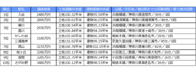 『新築一戸建て編』の1位は「入谷駅(JR相模線)」で、価格相場は2480万円、土地面積中央値100.32m2、建物中央値95.58m2となった。以下、2位「衣笠(JR横須賀線)」(価格相場:2890万円)、3位「寒川(JR相模線)」(同:2930万円)、「香川(JR相模線)」(同:2930万円)、5位「かしわ台(相鉄本線)」(同:3180万円)と続いた。トップ10にJR相模線の駅が4駅ランクインした。