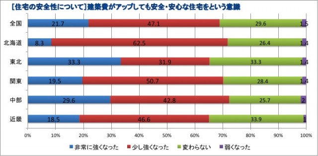 また約7割(68.8%)が「多少建築費が増えても安全・安心な住宅をという意識が強くなった」と回答。東北では33.3%、中部では29.8%がそうした意識が「非常に強くなった」と回答している。
