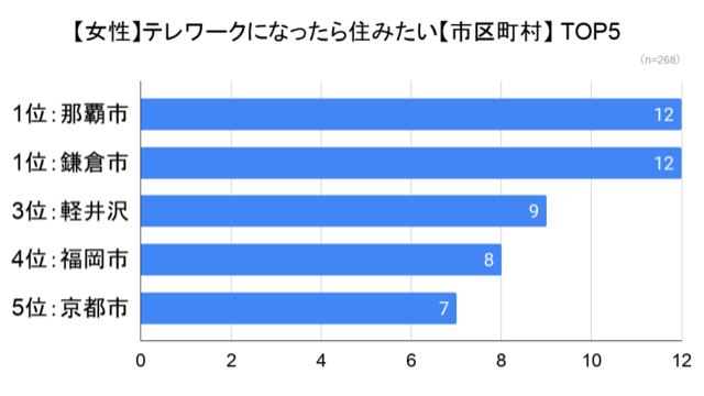女性の1位は「那覇市」と「鎌倉市」で、3位以降は「軽井沢町」、「福岡市」、「京都市」となった。女性では、男性とは異なり都心23区はすべてランク外となった。