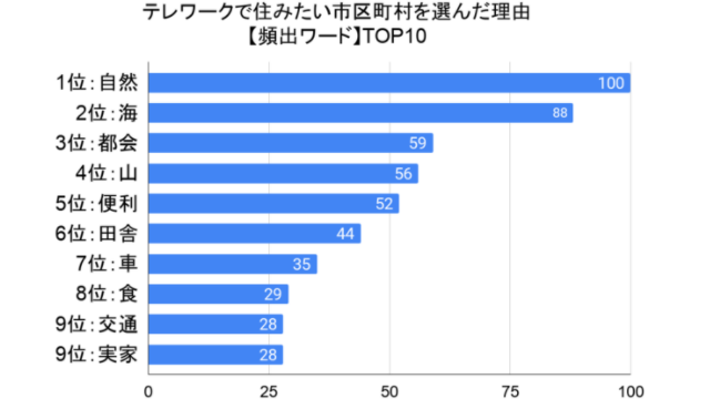 「なぜその市区町村に住みたいと思ったか」という質問に対する回答の頻出ワードを集計した結果、頻出ワード第1位は「自然」だった。次いで2位「海」、3位「都会」、4位「山」、5位「便利」となった