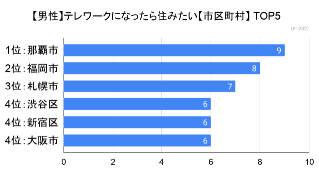 テレワークになったら住んでみたい『市区町村』ランキングでは、「那覇市」がトップとなった。選んだ理由としては、温暖な気候や利便性の良さ、沖縄県全体へのイメージの良さが大半を占めた。