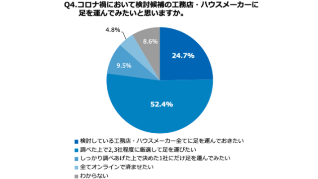 『コロナ禍において検討候補の工務店・ハウスメーカーに足を運んでみたいと思うか』聞いたところ、「調べた上で2、3社程度に厳選して足を運びたい」が52.4%、「検討している工務店・ハウスメーカー全てに足を運んでおきたい」が24.7%となった。4.8%は「全てオンラインで済ませたい」と回答した。