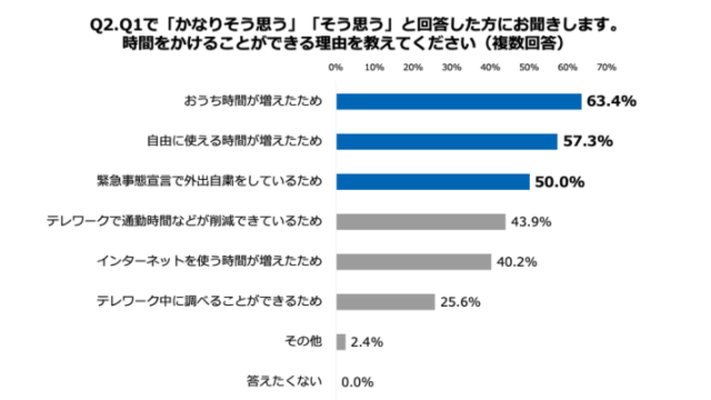 『住宅選びの情報収集に時間をかけられるようになった理由』としては、「家にいる時間が増えたため」が63.4%と最多。次いで「自由に使える時間が増えたため」(57.3%)、「緊急事態宣言で外出自粛をしているため」(50.0%)、「テレワークで通勤時間などが削減できているため」(43.9%)となった。