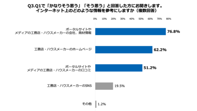 『参考にしている情報』は「ポータルサイトやメディアの工務店・ハウスメーカーの会社、商材情報」が76.8%、「工務店・ハウスメーカーのホームページ」が62.2%、「ポータルサイトやメディアの工務店・ハウスメーカーの口コミ」が51.2%、「工務店・ハウスメーカーのSNS」が19.5%となった。