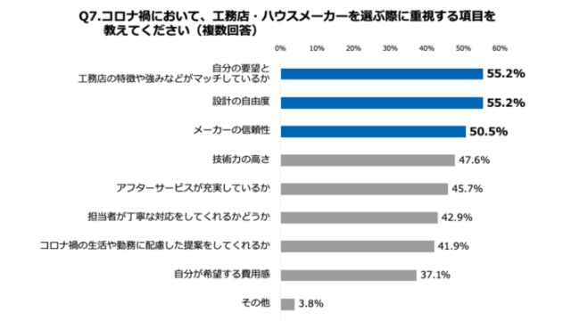 『コロナ禍において、工務店・ハウスメーカーを選ぶ際に重視する項目』としては、「自分の要望と工務店の特徴や強みなどがマッチしているか」と「設計の自由度」が同率トップで55.2%、「メーカーの信頼性」が50.5%となった。自由回答では「将来のリフォームを視野に入れた提案がもらえるか」、「誠実さ、設計力や提案力の高さ」、「いかに親身になってくれるか」などの声が聞かれた。