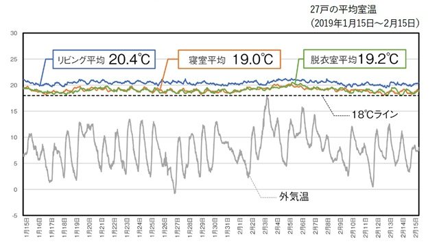 エコワークス(福岡市)は、自社が建築したHEAT20・G2の外皮性能を備える住宅の室温や電力消費量について、2019年の1年間にわたって行った調査の結果を分析し、このほど公表した。1月15日~ 2月15日の厳寒期でも、リビングで平均室温20.4℃を維持。G2の外皮性能と全館空調で、G3相当の室温になっていることを確認した。