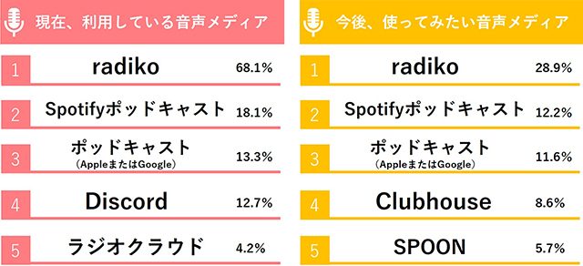 『今後、使ってみたい音声メディア』のトップ3は「radiko」(28.9%)、「Spotify ポッドキャスト」(12.2%)、「ポッドキャスト(AppleまたはGoogle)」(11.6%)。4位、5位には、フォロワーやトークルームといったユーザー間の双方向コミュニケーションが特徴の“音声SNS”「Clubhouse」(8.6%)、「SPOON」(5.7%)がランクインした。