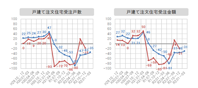 戸建て注文住宅は、受注戸数が△18ポイント、受注金額が△21ポイントと、6期振りにプラスとなった前期から再びマイナスとなった。前期は住宅ローン減税の適用期限の影響から駆け込み需要が起こったが、第3四半期は新型コロナの感染拡大により戸建て注文住宅の需要が縮小していることが顕著に表れた。今後の見通しでもマイナスが続く。