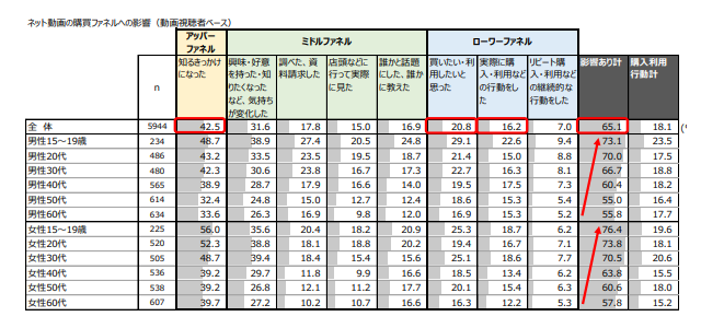ネット動画の視聴が購買行動プロセスの各ステップに影響を及ぼしているか調べたところ、動画視聴者ベースでは、「認知きっかけ」43%、「購入意向」21%、「実購入」16%と、購買ファネルにて何らかの影響があったと答えた人は65%にのぼった。調査全数ベースでも35%が購買ファネルにて何らか影響があったと答えた。年齢や男女別では、ネット動画視聴の購買ファネルへの影響は、年齢が低いほど強く、また、男性よりも女性の方が強い傾向にあることがわかった。さらに、閲覧頻度が高いほどこの影響が強く、動画のヘビー視聴層ほど動画が購買行動に影響していることがわかった。