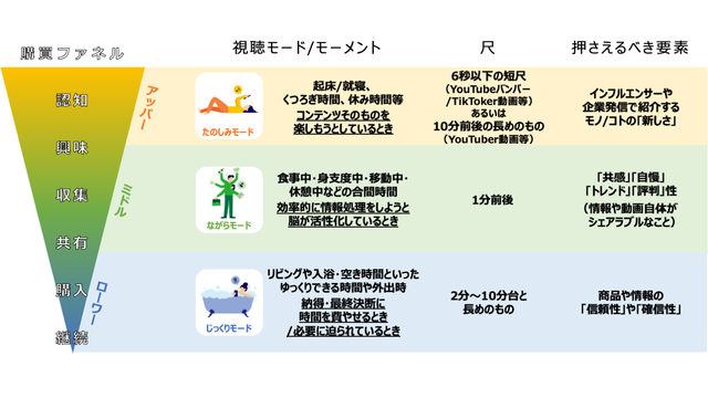「購入・利用・継続」段階においては、尺としては2分~10分台と長めのものが有効、要素としては情報の信頼性や確信性がポイントとなることがわかった。
