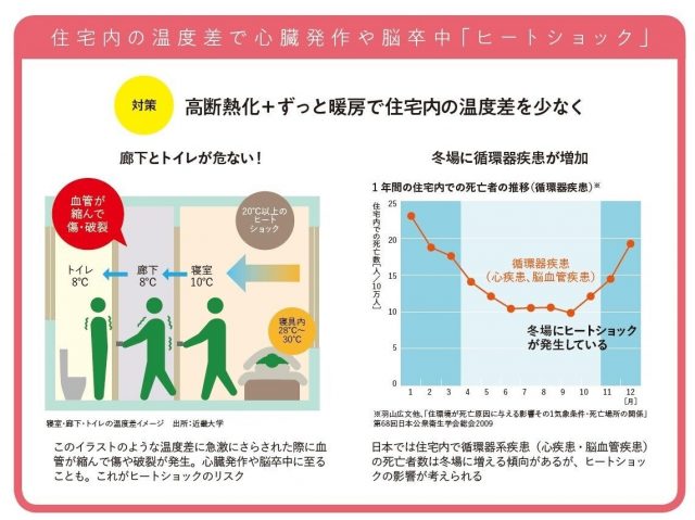 この温度差に急激にさらされることは人の体にとって大きな負担で、心臓発作や脳卒中を引き起こすリスクが高まります。これが「ヒートショック」です。夜中に目が覚めてトイレなどに行こうとして、この「ヒートショック」で亡くなってしまうケースは後を絶ちません。