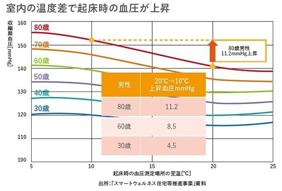 また、起床時の室温が20℃から10℃に下がると、60歳男性で血圧が平均8.5mmHg、80歳男性で平均11.2mmHg上昇したという結果も。高血圧で降圧剤を飲んでいる方も多いですが、降圧剤で下げることができるのは5mmHg程度とされ、高断熱化によって10mmHgの上昇を防止するほうが合理的でしょう。