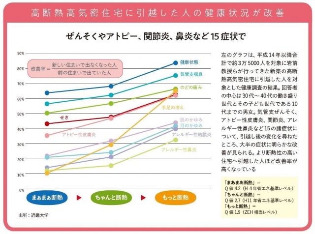 一方で、高断熱住宅に引越した家では家族の健康状態が改善したことが「スマートウェルネス調査」と呼ばれる国の予算を受けた調査によって明らかになっています。