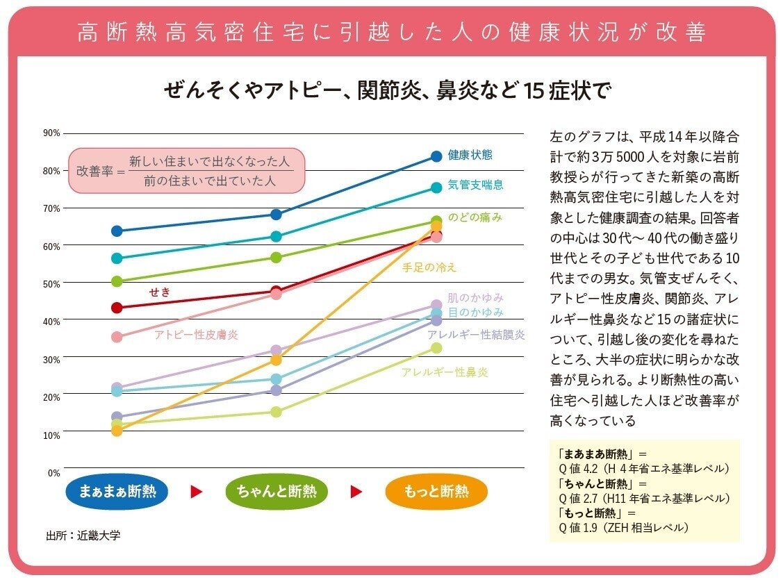 上図に挙げた諸症状を持っていた人を分母に、高断熱住宅に引越した後に症状が出なくなった人を分子にとった改善率を見ると、「ちゃんと断熱」した住宅に住み替えた場合で改善率は7割弱、「もっと断熱」した場合だと改善率は8割超に上りました。