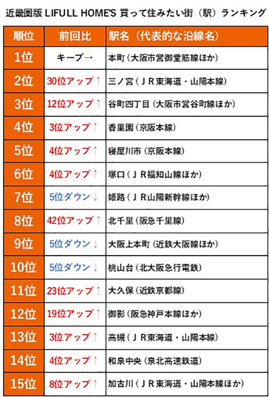 近畿圏版の「買って住みたい街」では、「本町」が昨年に続き1位を獲得。2019年には32位だったが、駅周辺にタワーマンションが相次いで新規分譲されたことで一気に注目度が高まって以降、高い人気を維持している。2位には前回32位から大きく順位を上げた「三ノ宮」、3位には前回15位の「谷町四丁目」がそれぞれランクインした。
