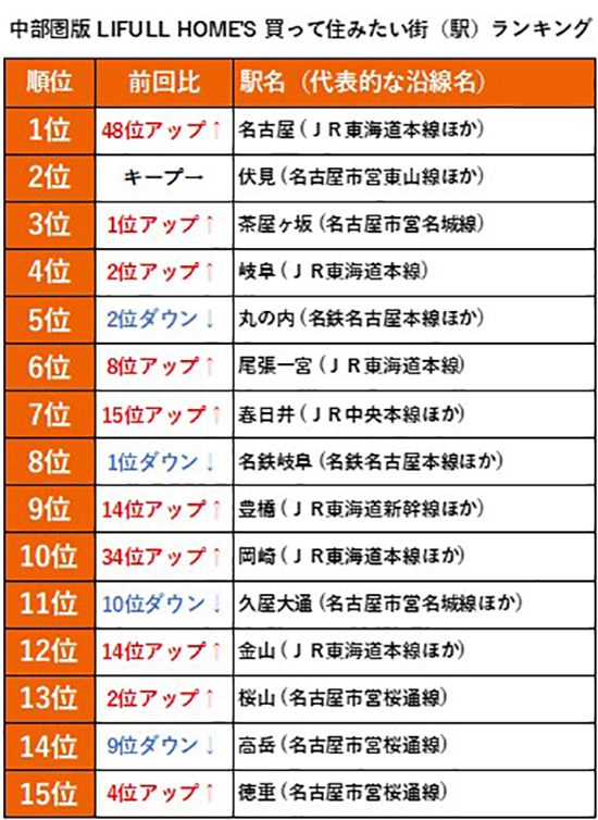 中部圏版では、「名古屋」が前回の49位から急上昇し、初の1位となった。同社では、「名古屋周辺は事業集積地でこれまで分譲住宅はほとんど建設されていなかったが、2020年に総戸数500戸前後のマンションが2物件分譲されたことで注目が集まり、順位を押し上げた」としている。2位は「伏見」、3位は「茶屋ヶ坂」となった。