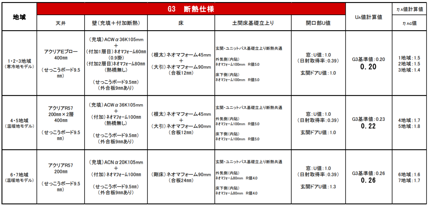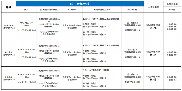 共同作成したのは、旭ファイバーグラスの繊維系・グラスウール断熱材「アクリア」と、旭化成建材の発泡プラスチック系・フェノールフォーム断熱材「ネオマフォーム」とを組み合わせることで、一般的な住宅工法でG2、G3という高い断熱水準をクリアできる仕様。それぞれの特徴を生かした理想的な組み合わせとして、充填性に優れる「アクリア」を壁内充填断熱と天井に、外張りや床施工に適した「ネオマフォーム」を壁外張り付加断熱と床に使用する。