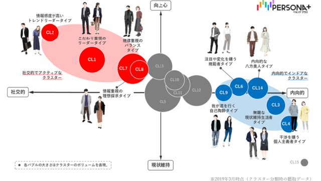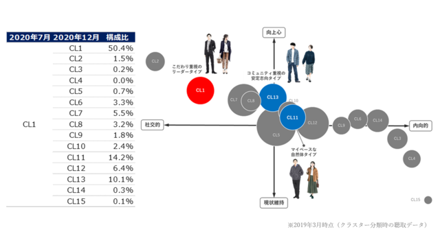 同調査では、同社が提供するペルソナマーケティング支援サービス「PERSONA+(ペルソナプラス)」を活用して調査対象者を15の価値観クラスターに分類し、2020年5月~12月における価値観変動を検証した。
