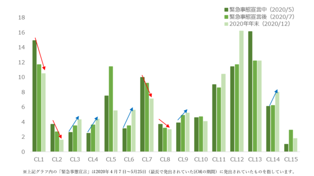 2020年5月から同年12月における、価値観クラスター構成比の変動を調べたところ、“こだわり重視のリーダータイプ”、“情報感度が高いトレンドリーダータイプ”といった「外向的でアクティブ」な層の構成比が減少していることがわかった。一方で、“注目や変化を嫌う規範者タイプ”や“内向的な八方美人タイプ”といった「内向的でインドア」な層の構成比が増加した。