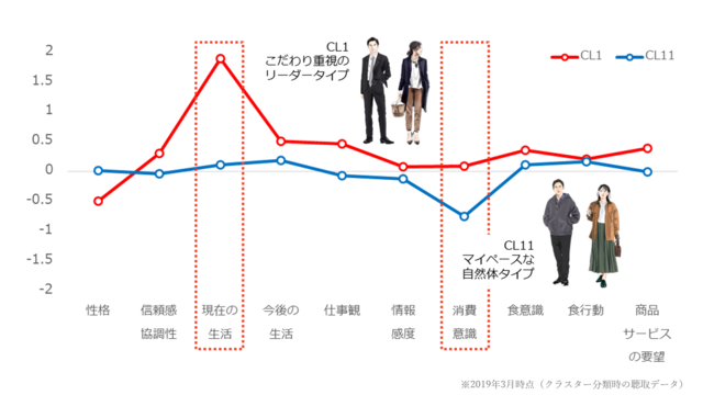 “こだわり重視のリーダータイプ”と“マイペースな自然体タイプ”の特性の違いを価値観に関する10因子で確認すると、「現在の生活」、「消費意識」因子に大きな乖離がみられた。同社では、「現在の生活満足度の低下と消費の抑制により、価値観クラスターに変化が起きている」と分析。また、より深く特性の違いを分析したところ、「リーダー要素」、「自己研鑽」因子に大きな乖離がみられたことから、「コロナによる巣ごもりは、消費などの行動面だけでなく、周囲や自己を高める精神面にも影響を及ぼしていることが伺える」としている。