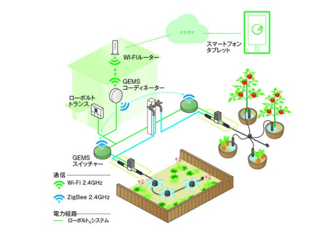 「GEMS」は、電気工事士資格がなくても安全に施工可能なローボルトシステムで動作しており、一般的な潅水システムのような電池切れの心配は不要。家庭のWi-Fiルーターを通じてインターネットとつながり、無駄のない最適な水やりを実現する。