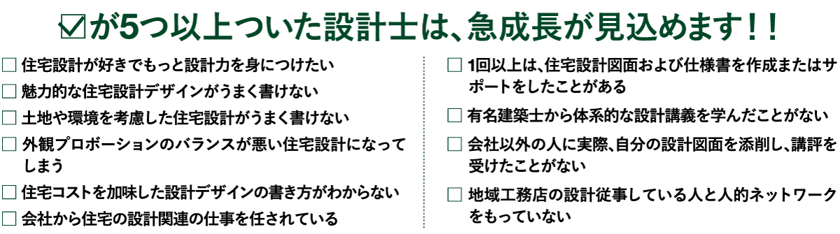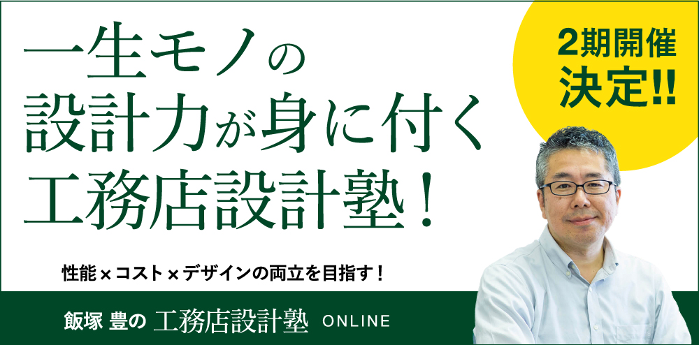 初回の1期(2020年10月)が、募集開始後すぐに満席になった工務店ミライ塾「工務店設計塾」の2期の開催が決定しました!オンライン添削・講評スタイルで地域工務店のための注文住宅設計力向上を目指します。塾長はi+i設計事務所主宰の飯塚豊氏。注文住宅の設計を基礎から応用まで全6回、段階的に学ぶことができます。毎月演習課題と設計のポイントが示されます。各自のプレゼンに対する設計講評と飯塚氏の課題解法説明により、間取りから考えない飯塚設計メソッドを学ぶことができる一生モノの設計力が身に付く設計塾です。