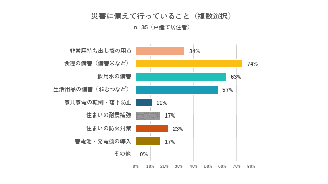 戸建て居住者が『災害に備えて行っていること』としては、「食料の備蓄」が74%と最多。次いで「飲用水の備蓄」(63%)、「生活用品の備蓄(おむつなど)」(57%)、「非常用持ち出し袋の用意」(34%)となった。戸建て居住者では「防火対策」(23%)や「耐震補強」(17%)など、住まいそのものへの対策を実施している人の割合がマンション居住者に比べ高かった。