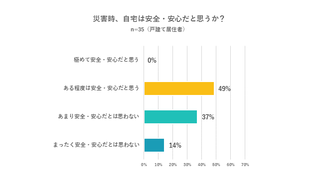 『災害時、自宅は安全だと思うか』聞いたところ、戸建て居住者では「ある程度は安全だと思う」が49%、「あまり安全だと思わない」が37%、「まったく安全だと思わない」が14%となった。戸建て居住者、マンション居住者ともに「極めて安全だと思う」は0%だった。自宅が安全だと思う理由を聞いたところ、戸建て居住者からは「リスクの低い土地だから」、「耐震性を気にして建てたから」、「築年数が浅いから」などの回答が挙げられた。