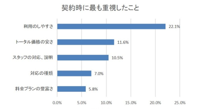 契約時に最も重視したことを聞いたところ「利用のしやすさ」が22.1%と最も多かった。次いで「トータル価格の安さ」(11.6%)、「スタッフの対応、説明」(10.5%)となった。