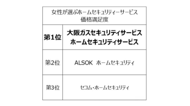 価格満足度は、1位が「大阪ガスセキュリティサービス ホームセキュリティサービス」、2位が「ALSOK ホームセキュリティ」、3位が「セコム・ホームセキュリティ」となった。