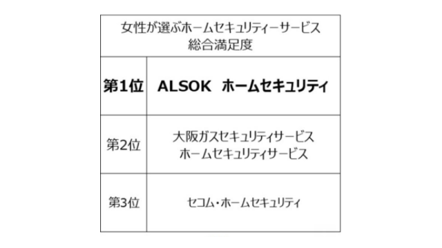 総合満足度は、1位が「ALSOK ホームセキュリティ」、2位が「大阪ガスセキュリティサービス ホームセキュリティサービス」、3位が「セコム・ホームセキュリティ」という結果に。