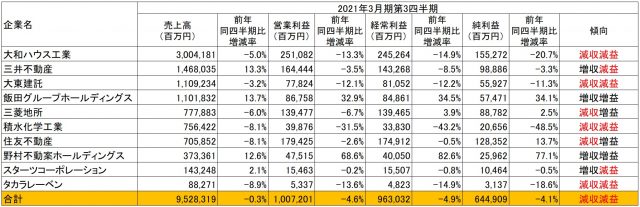 住宅・不動産業では、主要10社(大和ハウス工業、三井不動産、大東建託、飯田グループホールディングス、三菱地所、積水化学工業、住友不動産、野村不動産ホールディングス、スターツコーポレーション、タカラレーベン)のうち、売上高は6社が前年同四半期を下回り、うち4社が減収減益となった。10社合計の売上高は、前年同四半期比▲0.3%(第2四半期は▲6.5%)、純利益は同▲4.1%(同▲26.5%)と、第2四半期よりも売上高、純利益ともに改善した。2021年3月期の通期業績予想は、三菱地所とタカラレーベンが売上高、純利益ともに上方修正、積水化学工業が売上高を上方修正、野村不動産ホールディングスが売上高を下方修正、純利益を上方修正している。