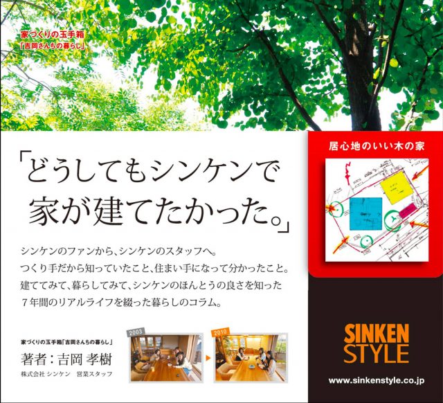 あこがれて、あこがれて、建ててもらったシンケンの家に妻とふたりで住んでいます。皮肉なもので、実は会社を離れてからの方が家をじっくり味わうことができています。「この時期、この時間にここが陽だまりになるんか…」とか、「ずーっとここに座ってごはん食べてたけど、こっち向いて食べたほうがなんか美味いぞ」とか、発見はとどまることはありません。