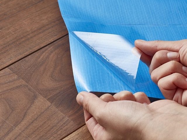 ブルーシートの裏面に粘着剤が塗布された商品。補修場所のサイズに合わせてカットできるため、テープなどがなくても単体で簡易補修が可能。二次被害を抑制できるという。