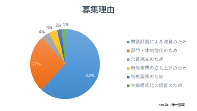 人員募集の理由としては、「業績好調による増員のため」が62%と最多。次いで「部門・体制強化のため」(27%)となっている。