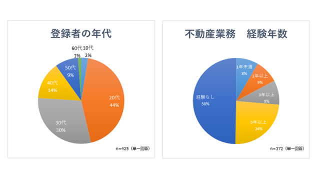 登録者(転職希望者)の傾向について、年代は「20代」が44%、「30代」が30%と、7割以上を若い世代が占めている。不動産業務経験者と未経験者の比率は1:1と、ほぼ同じ割合で存在。加えて、40代の登録者の約7割は不動産業務経験者であることもわかった。