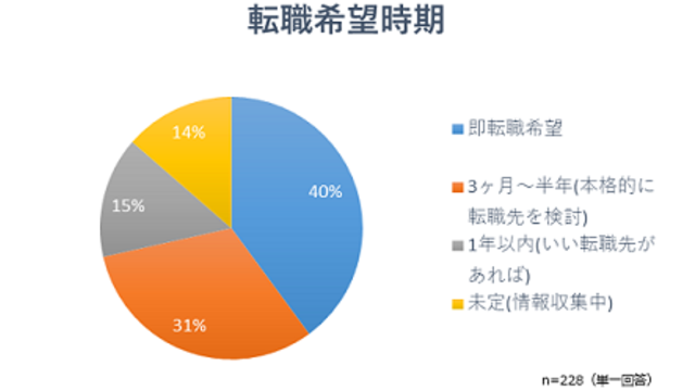 転職の希望時期としては「即転職希望」が40%、「3カ月~半年(本格的に転職先を検討)」が31%と、具体的な転職目標時期を持って活動している登録者が多いことがわかった。即転職を希望する人の多くは、新型コロナの流行により、「自身のキャリア・収入の不安」や「業績悪化による会社の将来への不安」を感じたことをきっかけに転職活動を開始しているという。また同社では、異業種から不動産業界への転職を希望する登録者が多い理由の一つとして、他の業界と比較しコロナ禍でも業績が堅調な企業が多いことが考えられるとしている。